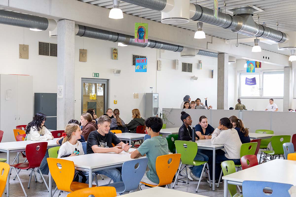 Frisch gekochtes Essen in der Mensa, Snacks im Bistro, Wasserspender – und in Klasse 5 ein gemeinsamer Mittagstisch mit Klassenlehrkräften.